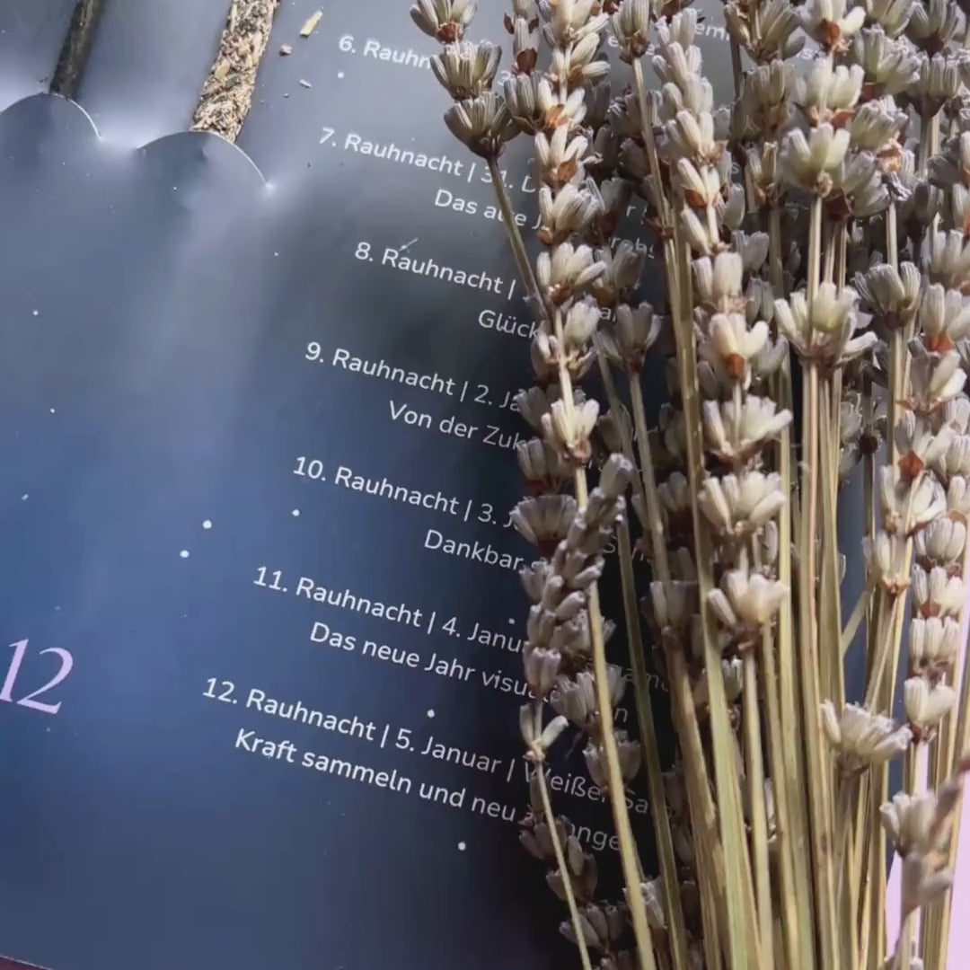 Die Räucherstäbchen wurden von uns speziell ausgewählt, um mit ihren Kräutern, Harzen und Aromen zu den Themen der einzelnen Rauhnächte zu passen. Du findest unter anderem Sorten wie Beifuss, Copal & Rose, Zimt & Kiefer oder Weißer Salbei, um dich während der Rauhnächte zu begleiten. Im Set enthalten sind auch einige gröbere Räucherstäbchen, auch Smudge-Räucherstäbchen genannt. Die Themen der jeweiligen Tage bzw. Nächte stehen an der Seite, um dein Räucherstäbchen täglich mit einer passenden Intention zu entzünden.